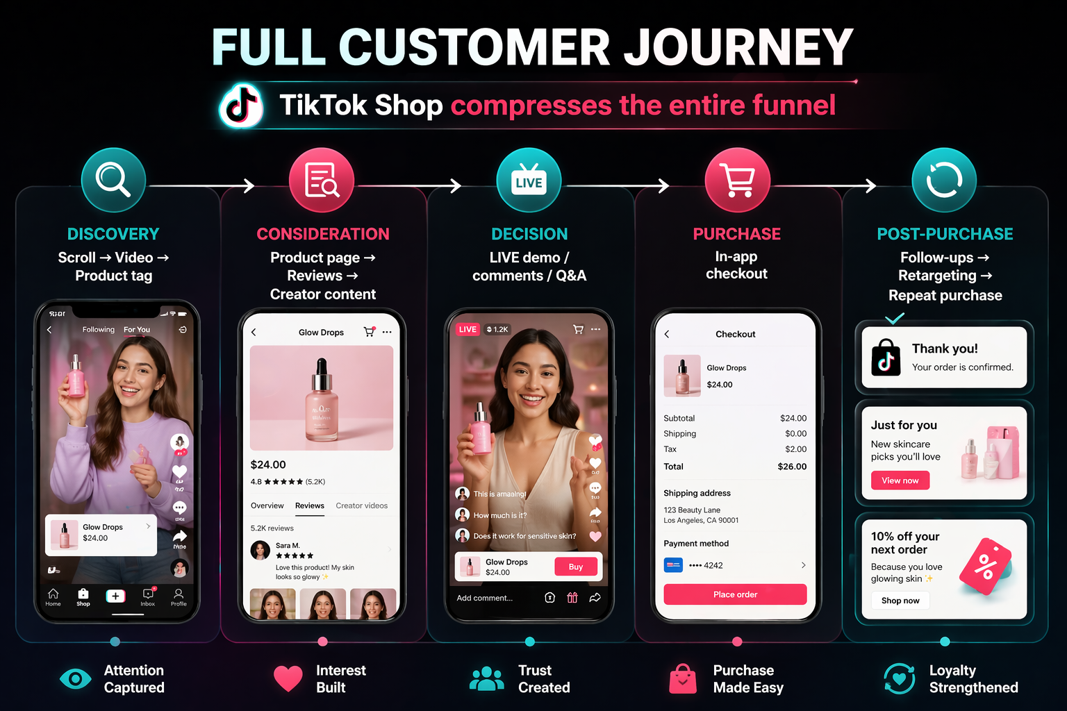 TikTok Shop collapses the entire ecommerce funnel into one platform, turning content into a direct sales channel. It combines discovery, product interaction, and checkout in a single in-app experience.