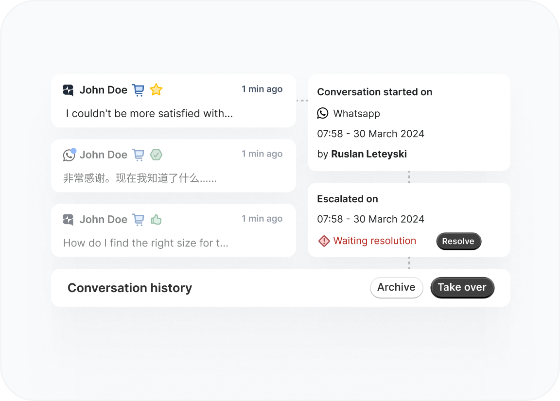 Zipchat hands off to your team automatically with full conversation context included. The customer doesn't have to repeat themselves, and your agent sees everything discussed so far. This keeps the experience smooth and professional while ensuring complex issues get human attention.