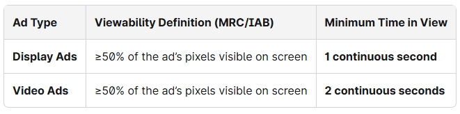 Ad viewability measures whether an ad was actually seen by a user. According to MRC/IAB standards, a display ad counts as “viewable” when at least 50% of its pixels are visible for one continuous second (or two seconds for video).