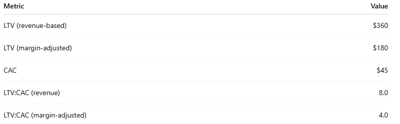 - Revenue-based LTV:CAC = 360 ÷ 45 = 8.0.