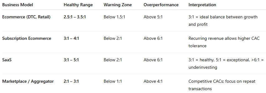 - If you sell low-margin products (like apparel or CPG), you might be fine closer to 2:1.