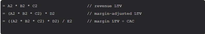 - AOV in A2, Frequency in B2, Years in C2, Margin in D2, CAC in E2