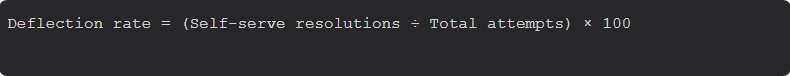 Example: If 200 customers see a proactive message and 50 solve their issue without submitting a ticket, your deflection rate is: