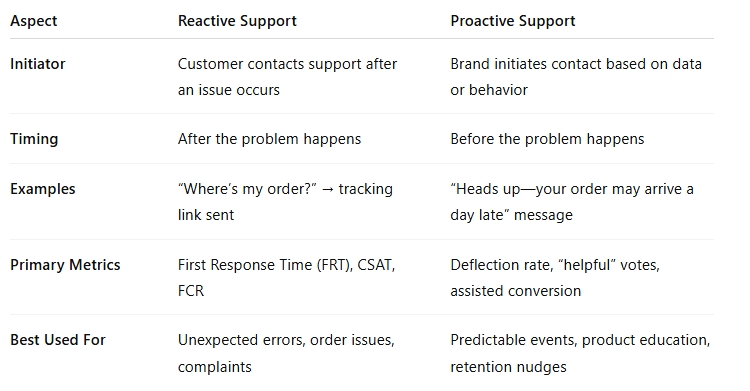 Reactive support responds to issues after a customer contacts you, while proactive support addresses potential problems before they occur. Together, they ensure faster resolutions, fewer repeat tickets, and higher overall satisfaction.