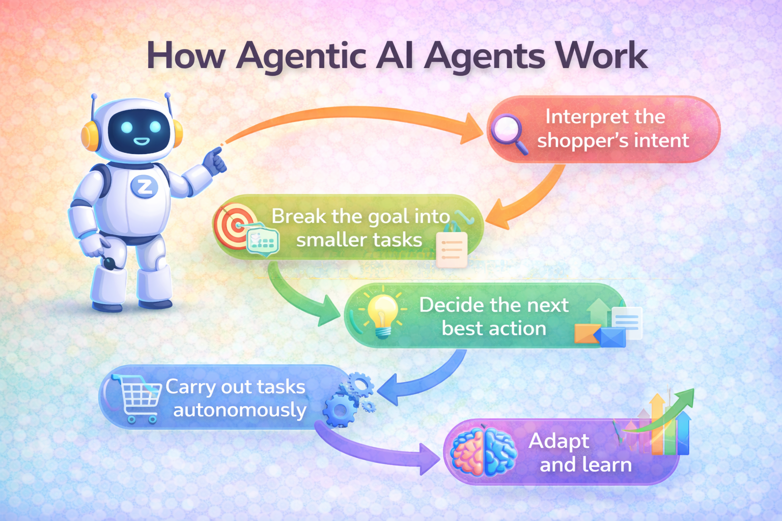 Agentic commerce works by using AI agents that interpret shopper intent, break goals into tasks, choose the best next action, and execute those actions autonomously. Over time, these agents learn from outcomes, improving recommendations, assistance, and decision-making across channels.