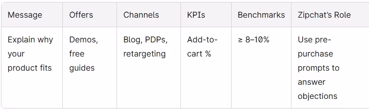 Here’s how to structure your ecommerce marketing funnel around five key stages, each with clear goals, KPIs, and actionable plays.