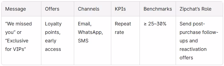- Expand retention plays: Launch loyalty or referral programs; re-engage dormant customers via email or WhatsApp.