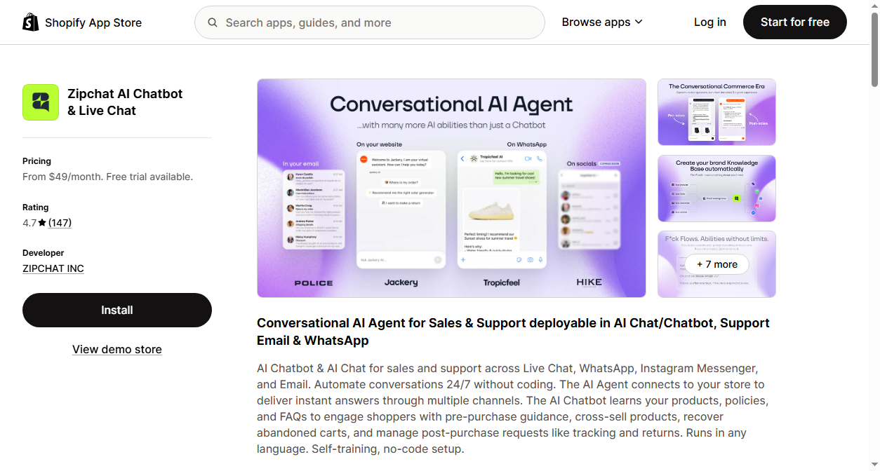 Zipchat AI Chatbot & Live Chat adds real-time conversation to your Shopify store. Instead of static pages, shoppers can ask questions and get instant answers. The AI connects to your products, policies, and FAQs to guide visitors before and after purchase.