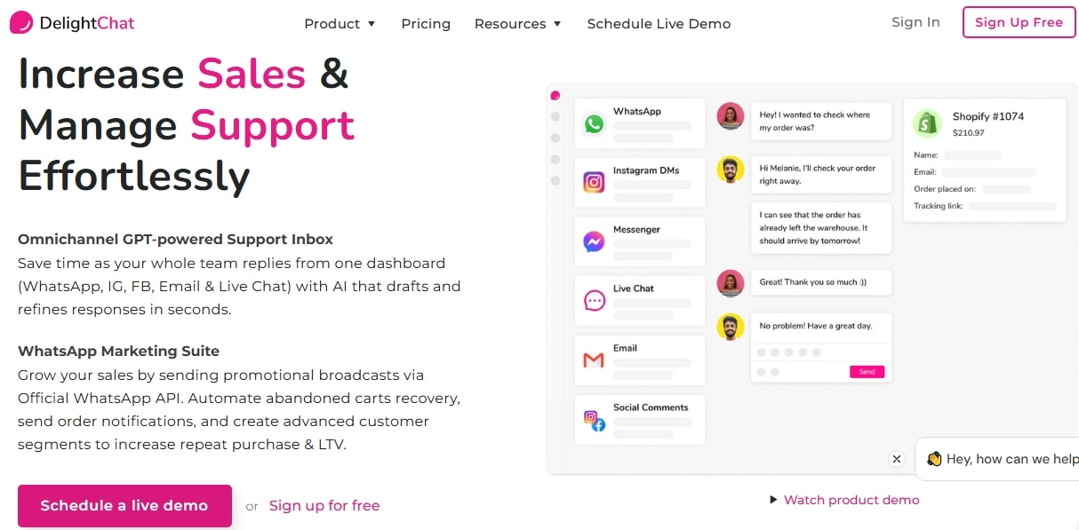 DelightChat helps many ecommerce businesses manage WhatsApp messages, Instagram DMs, and Facebook chats from one inbox. It’s especially popular with brands selling in regions where WhatsApp is the main communication channel.