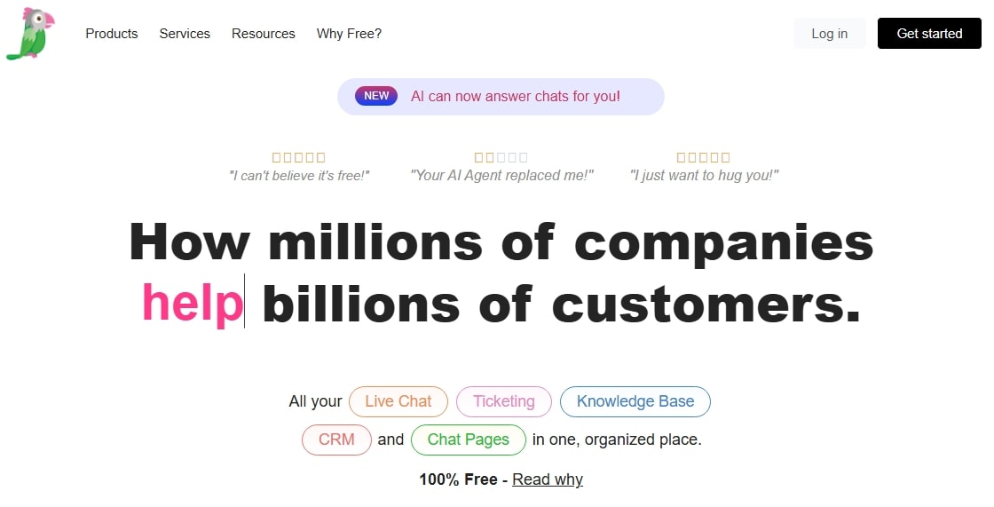 | Tawk.to | Fully free live chat (unlimited agents, unlimited chats/sites), real-time visitor monitoring, ticketing, knowledge-base, multilingual support, unlimited chat history, basic automation. | Free forever (core functions); optional add-ons (Al assist, branding removal) at additional cost. | 4.5/5 |