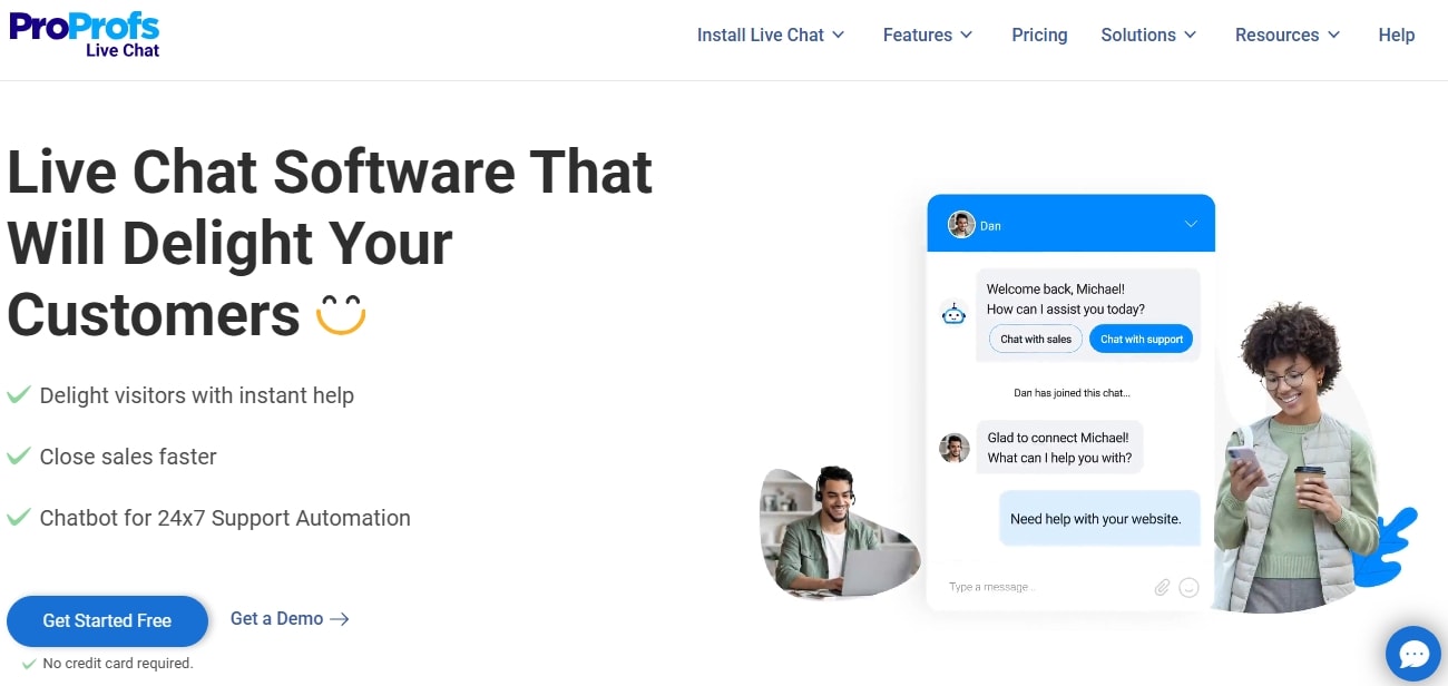 | ProProfs Chat | Live chat + chatbots, proactive greetings, analytics, integrations, pre-chat forms | Free + paid plans start at $499/mo | 4.4/5 |