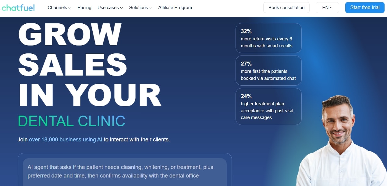 | Chatfuel | Bot building (Messenger, Instagram, WhatsApp), templates, NLP flows, broadcast & automation | From $23.99/mo | 4.4/5 |