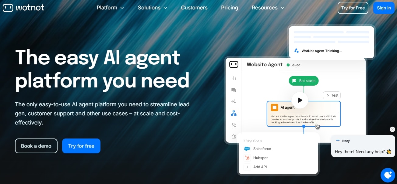 WotNot works well for businesses that want to quickly spin up automated chat funnels without engineering support. It’s a flexible, drag-and-drop builder that helps qualify leads, capture intent, and automate basic pre-sales conversations across web chat and messaging channels.