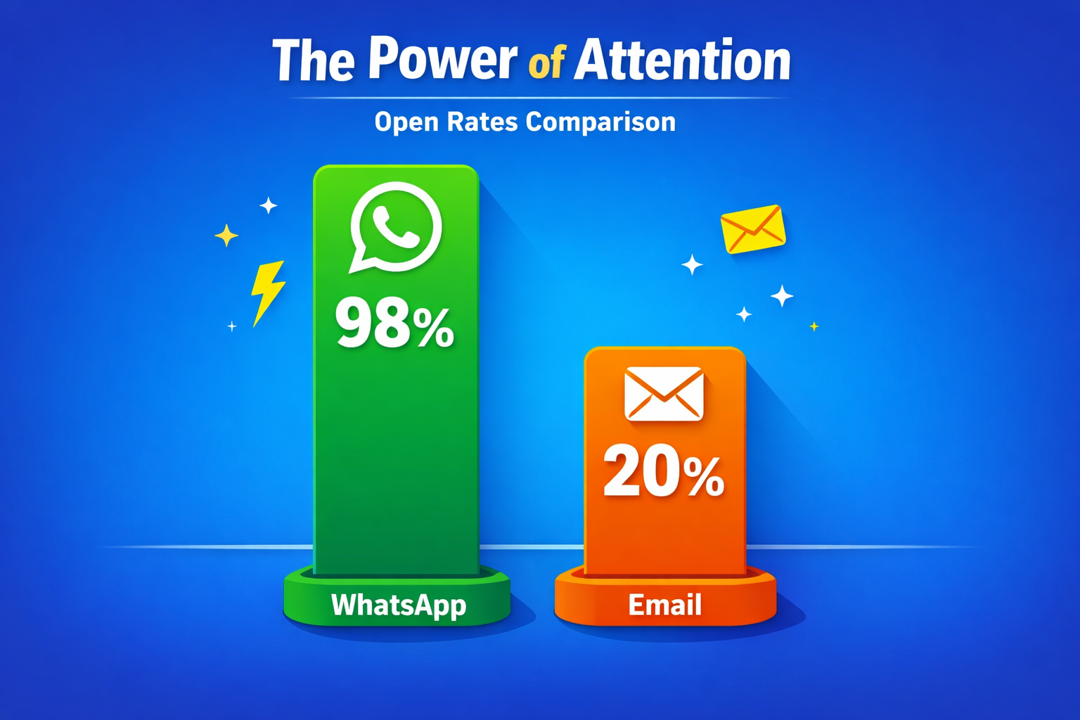 - Extremely High Open Rates: WhatsApp messages achieve an average open rate of 98%, compared to around 20% for email campaigns. This ensures your message reaches your audience almost every time.